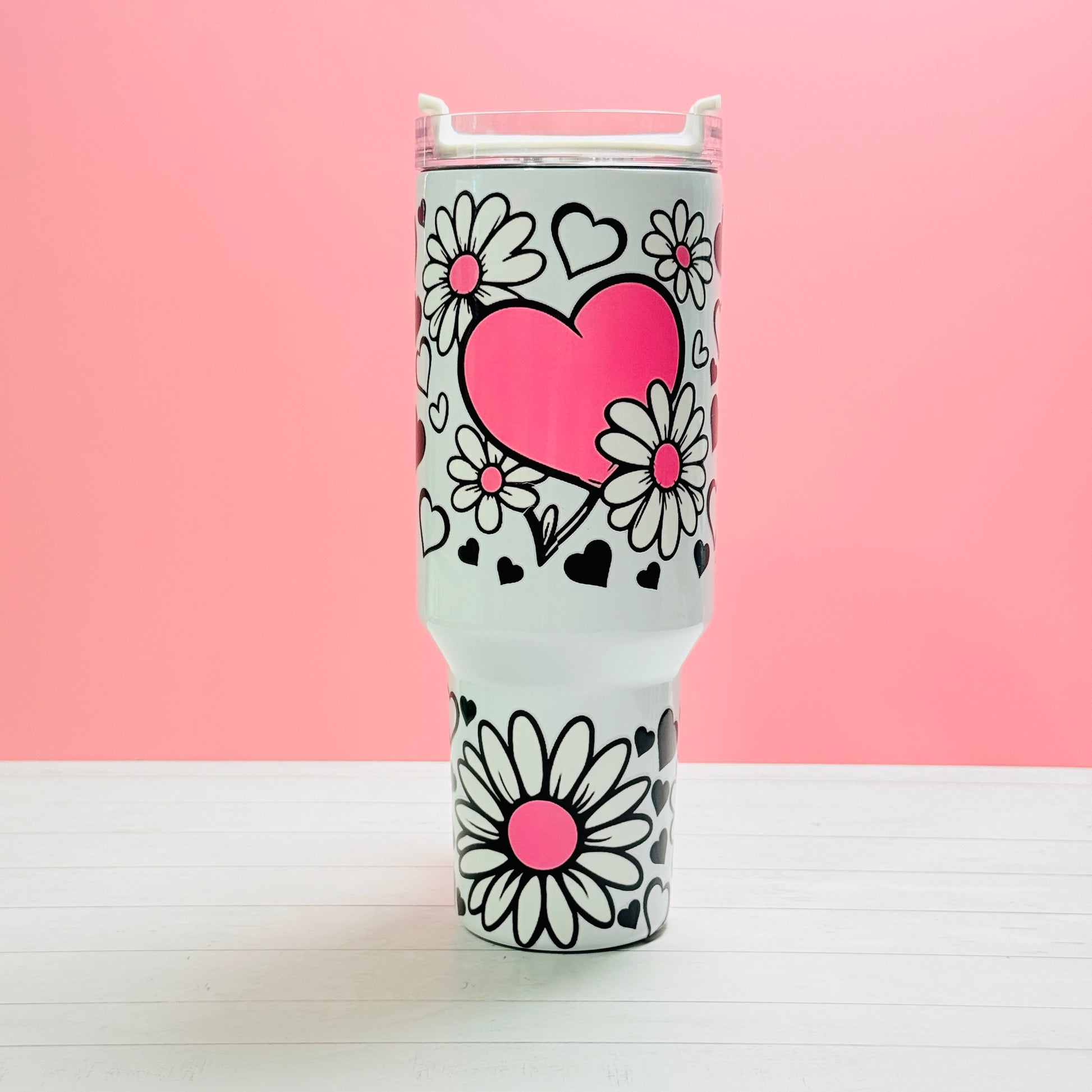 40oz Stainless Steel Tumbler with Handle – UVDTF Wrap with Black, White & Pink Heart and Flowers