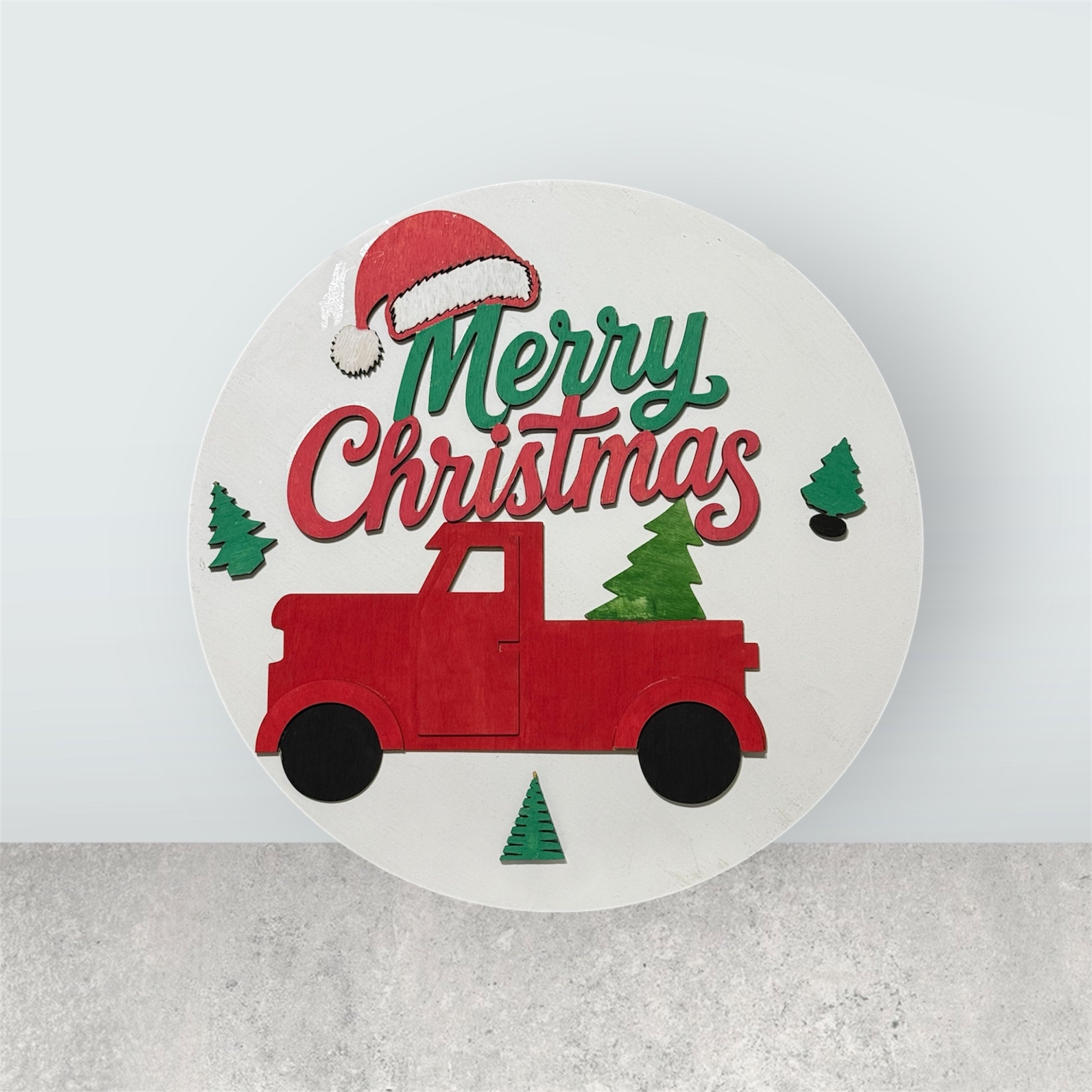 Celebrate the season in classic holiday style with this Merry Christmas Red Truck Door Sign! Featuring a vintage red truck carrying Christmas trees, festive layered lettering, and a cute Santa hat accent, this round wooden sign adds the perfect touch of nostalgic charm to your holiday décor.