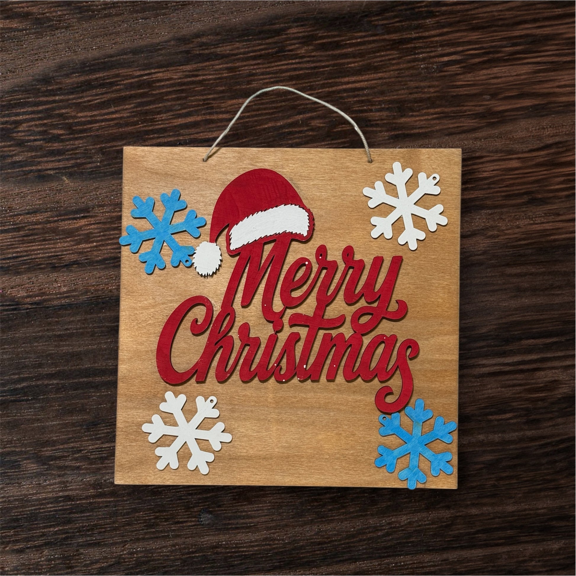 Add cozy Christmas charm to your home with this Rustic Merry Christmas Wooden Door Sign! Featuring layered 3D lettering, a festive Santa hat, and bright snowflakes in winter blue and white, this square wood sign brings a warm, handcrafted touch to your holiday décor.