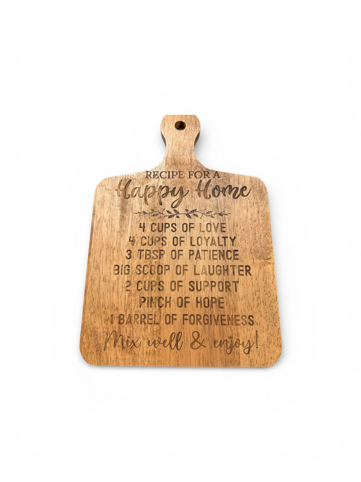 Recipe for a Happy Home Wooden Cutting Board Sign | Engraved Farmhouse Kitchen Decor | Meaningful Housewarming Gift